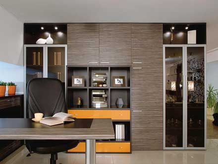 В таком оригинальном кабинете комфортно будет как любителю экзотических путешествий, так и тому, кто только мечтает о дальних странствиях. Корпус основной композиции и стеллажа под подоконником — декор «Арабика», распашные фасады основной композиции и выдвижных ящиков под окном — экзотический декор «Зебрано «Кения». Фасады выдвижных ящиков выполнены в высокоглянцевой эмали «Апельсин». Симметричные распашные фасады из стекла «Мокко» в рамах «Джамп» придают композиции изящность и законченность. Подсветка верхних открытых полок — светильники «Министар». В столешнице скомбинированы два основных декора композиции — «Арабика» и «Зебрано «Кения».
