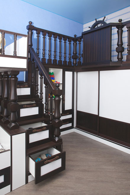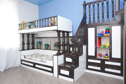 Комплект мебели выполнен из массива сосны и ЛДСП немецкого производителя. На заказ возможна любая комплектация для вашего ребенка. Данная модель будет не только красивой и удобной, но и безопасной в использовании, что особенно важно, когда в доме двое малышей.