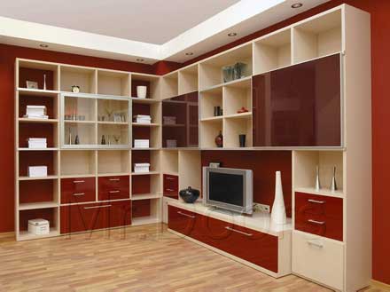 Угловая гостиная с TV-зоной серии «Студио 38» с раздвижными фасадами. Корпус выполнен в декоре «Сливки». Раздвижные стеклянные фасады (прозрачное стекло и «Рубин») вставлены в алюминиевую раму «Футур». Фасады выдвижных ящиков и откидных дверей покрыты высокоглянцевой эмалью цвета «Бордо».