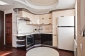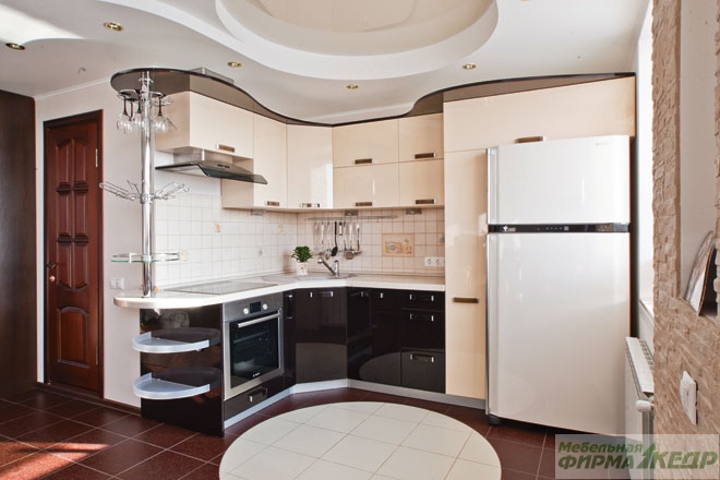 Плавные очертания. Гарнитур был изготовлен специально для данного помещения: форма крыши повторяет округлые линии потолка и напольной плитки, бытовая техника интегрирована в мебель, а барная стойка органично завершает композицию. Фасады выполнены из лакированного МДФ цвета ванили и шоколада, кремовая столешница изготовлена из искусственного камня.