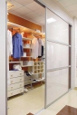 Просторная гардеробная с дверями XL. Две  раздвижные двери XL (шириной 2 м 80 см каждая) со вставками «Палисандр» и «Крем» (эмаль) красивы и практичны. Корпус гардеробной — декор «Сливки». Внутреннее наполнение гардеробной — модули, выдвижные ящики и каркасы «Инсис», стойки и подставки под обувь «Лофт», декоративные светильники «Люмина».