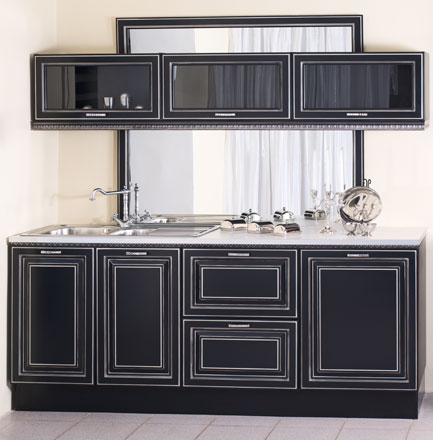 Для изготовления фасадов кухни «Корсика» используется МДФ с двухсторонним полиуретановым покрытием с эффектом патинирования серебром по лицевой стороне, что обеспечит надежную защиту в условиях эксплуатации.