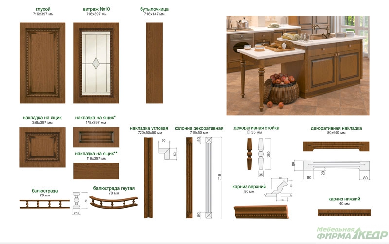 Основа: плита МДФ толщиной 19мм, облицованная матовой пленкой ПВХ. Отделка: патинирование, лакирование. Декоративные элементы: МДФ, облицованная матовой пленкой ПВХ, массив дуба.