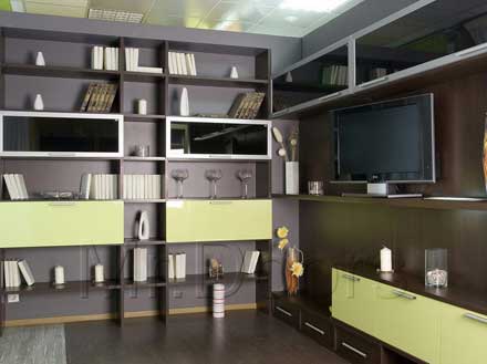 Корпус, полки и откидные фасады нижнего яруса — «Дуб Торонто» эффектно оттеняют откидные глянцевые фасады, выполненные в декоре «Лайм», и рамочные фасады «Джамп» с черной стеклянной вставкой. Средняя полка подсвечена светильниками «Доппио».