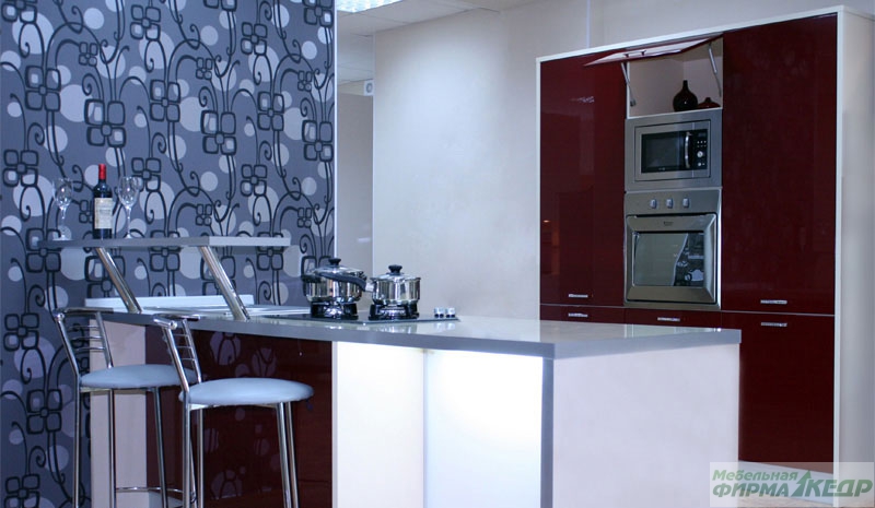 Использование для фасадов кухонного гарнитура высокоглянцевой пленки ПВХ — это просто «кладезь» для дизайнерских идей: широкая цветовая гамма от ярких локальных до пастельных тонов, древесные, фантазийные и металлизированные декоры, с эффектом «3D». Декоры можно использовать как самостоятельно, так и комбинировать. Фасады из высокоглянцевой пленки гармонично сочетаются с натуральными шпонированными покрытиями, как глянцевыми, так и матовыми алюминиевыми аксессуарами. Полупрозрачное стекло увеличивает эстетическую привлекательность кухни, привнося в интерьер легкость и воздушность.