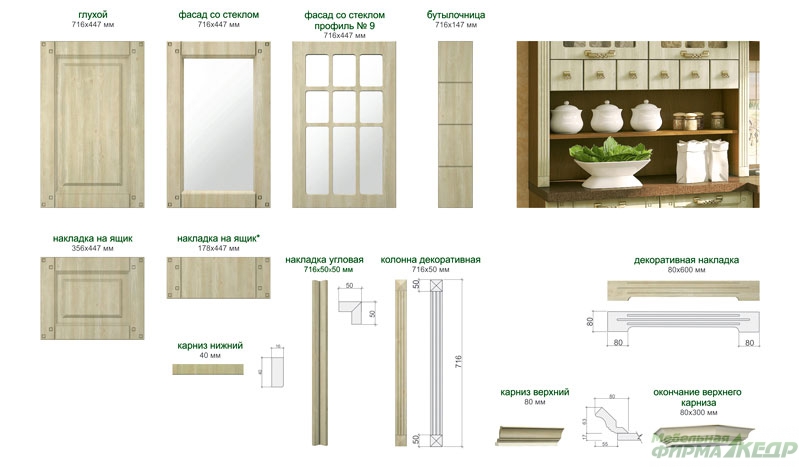 Модель выполнена в рустикальном стиле, который близок к стилю кантри. Имитация ярко выраженой грубой почти не обработанной фактуры — трещины, признаки старения, гвоздики и сучки становятся своеобразным декором на фасадах кухни. «Рустика» воплощает в себе очарование провинции, гармонию и чистоту простых линий.